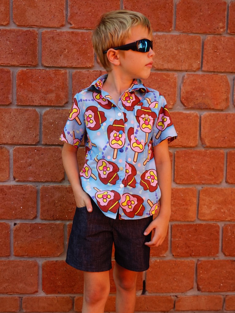 Pattern: Tadah Troop Shirt from Tadah, Joey Jeans from Rebecca Page. Fabric: Bubble O’Bill Woven from ‘Fabric by Missy Rose’, Denim from Spotlight.